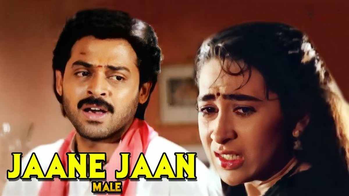 “Jaane Jaan” is a beautiful song from the 1993 film Anari. Enjoy the melodious voices of Sadhna Sargam and Udit Narayan in Jaane Jaan. The amazing words of this song have been penned by Sameer. Venkatesh Daggubati, Karishma Kapoor, Suresh Oberoi, and Gulshan Grover have played pivotal roles in Anari. Read the lyrics of Jaane Jaan in Roman Hindi now: